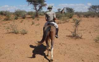 Eine weitere Aktivität auf der Farm ist die Arbeit mit Pferden. Nach der morgendlichen Reinigung der Ställe, geht es auf einen Ausritt. Dieser wird meist mit einer weiteren Aufgabe kombiniert, wie z.B. einem Game Count (Bestandszählung) oder der Kontrolle der Wasserlöcher in der Umgebung.