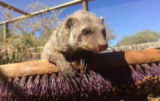 Eine der wichtigsten Aufgaben auf der Farm ist die Vorbereitung des Futters. Dazu gehört sowohl das Gemüse für die Schildkröten, als auch das Fleisch für Geparden & Co. Für alle Tiere gibt es ein eigenes Menu, auf dem genau beschrieben wird was verwendet werden soll und wie es zuzubereiten ist. Dies ist wichtig, da manche Tiere bestimmte Nahrungsmittel nicht fressen dürfen oder eine besondere Diät bekommen. So zum Beispiel bei Zebra-Manguste „Pumpkin“. Pumpkin wurde als Haustier gehalten und hat durch ihre falsche Ernährung körperliche Fehlbildungen wie ein zu schmales Becken und zu kurze Beine. Sie hat außerdem eine erweiterte Speiseröhre, die ihr bei zu hastigem Fressen schon mehrfach zum Verhängnis wurde. Bereits drei Mal musste sie wegen drohenden Erstickens unter Narkose notbehandelt werden. Um Verschlucken vorzubeugen, bekommt sie ihr Fleisch mittlerweile kleingeschnitten und stückweise mit einer Pinzette verabreicht. Da sie außerdem mit Übergewicht auf die Farm kam, gibt es für sie anstatt rotem Fleisch nur mageres Hühnerfleisch.